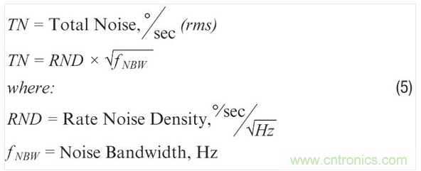 提供連續指向控制的系統開發者可能更愿意從角速率方面來評估噪聲影響,因為他們可能沒有固定的積分時間來利用基于ARW的關系。從角速率方面評估噪聲常常要考慮RND參數和陀螺儀信號鏈的頻率響應。對陀螺儀頻率響應影響最大的常常是濾波,其支持環路穩定標準的專用要求,并能抑制對 環境威脅(如振動)的不相干傳感器響應。公式5給出了一種簡單方法來估算與特定頻率響應(噪聲帶寬)和RND相關的 噪聲。
