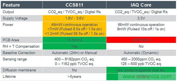 和CCS801相比,CCS811繼承了其很多優點,如:出色的感測范圍與精度、支持長達5年壽命的特殊工藝等等。而兩者最大的差異在于,CCS811是一個數字VOC傳感器,其內部集成了一個MCU,可以直接對傳感器的驅動和測量進行管理,并通過一個I2C接口與外部進行數據通信。雖然集成了更多的功能,CCS811仍然保持了相當“纖細”的身材,采用2.7 x 4.0mm的LGA封裝,使得PCB占板面積可以節省60%,節省了BOM成本。同時,由于內部還集成了相應的算法,使得終端產品的開發也得以簡化,進一步降低了整體的成本。想必消費類用戶看到下面這個CCS811的性能清單,會非常動心。