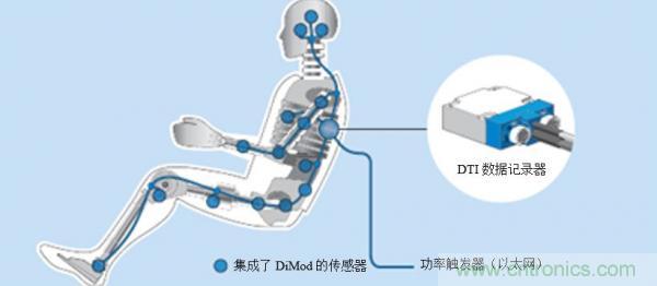 采集好的傳感器數(shù)據(jù)之后會(huì)被傳遞給假人體內(nèi)的奇石樂DTI中央數(shù)據(jù)記錄器,再通過以太網(wǎng)繼續(xù)傳給COMBox/KiHUB數(shù)據(jù)接口設(shè)備。車內(nèi)所有DTI系統(tǒng)通過該設(shè)備與中央網(wǎng)絡(luò)相連。這種解決方案的亮點(diǎn)在于:同步數(shù)據(jù)、觸發(fā)測(cè)試、供電僅需一根電纜。電纜始于假人,終于車載數(shù)據(jù)采集器。采集器一般通過隨行電纜等與主機(jī)相連。