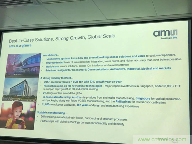 艾邁斯半導體的新型光學技術產量不斷提升,以新加坡為主要資本投資市場,針對最新的具有人臉識別技術的高端智能手機進行了相關投產。在8到9個月的時間里新增了8000多名全職員工,以支持3D和光學傳感領域的迅速增長。艾邁斯半導體在全球擁有多個生產基地,其中,奧地利工廠負責前端晶圓制造,新加坡負責光學傳感器生產和封裝以及未來VCSEL制造,菲律賓負責測試/傳感器校準。去年,艾邁斯半導體大概只有2000多名員工,今年已經有超過11000名員工了。艾邁斯半導體非常積極地擴展制造能力,與全球技術合作伙伴開展合作,為客戶提供差異化解決方案。