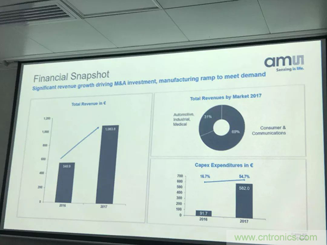 據介紹,艾邁斯半導體的營業收入去年到今年的增長用歐元計價是93%,用美元計算是100%。其中消費和通訊市場占了70%,這里面最主要的還是手機市場。另外31%是汽車、工業與醫療市場。而且,總體來說,兩邊的市場規模都增長得非???。“為了進一步支持這個增長,我們在資本和研發的投資是非常巨大的。當然我們利潤增長也很高,大概74%,這也說明我們公司的盈利狀況也很好。” Everke說。