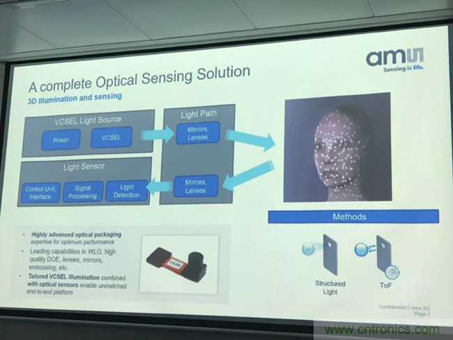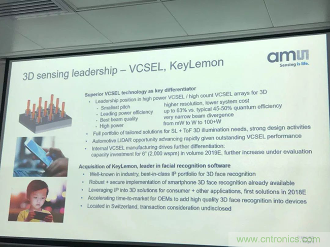 收購案例#2:艾邁斯半導體曾收購一家在做面部識別軟件方面特別強的企業KeyLemon,這家公司已有7年的歷史了,具備領先的3D人臉識別知識產權庫。同時,他們的軟件現在已經能在安卓系統中運行了。因此,艾邁斯半導體可以在消費類應用中提供可用于3D感應的軟件+硬件解決方案。“我們本身的傳感優勢,加上收購企業的技術,我們便可提供世界一流的完整解決方案。除了VCSEL之外,還有TOF(飛行時間)和結構光等,可以通過我們的傳感技術整合成一個完整的解決方案。” Everke指出。