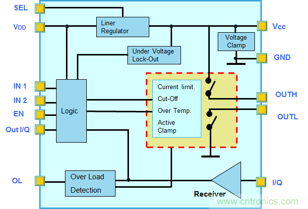 如圖2所示,L6362A單片集成3.3V/5V線性穩壓器;SEL引腳具有輸出電壓選擇功能;最大輸出電流12mA。穩壓器還驅動內部邏輯單元,通過邏輯單元中的透傳接口,驅動導通電阻Rds(on)極低的片上輸出級(典型值1Ω)。通過IN1和IN2兩個引腳的電平可以配置輸出級(高低邊),同時器件外部連接OUTH和OUTL可實現推挽配置。當EN引腳置低邏輯電平時,輸出級關閉。電感在高邊配置下實現快速去磁;在推挽配置中,因為低邊開關導通,所以慢速去磁有效。輸出級高速傳輸性能使通信速度達到COM3(230.4 kbps)水平。