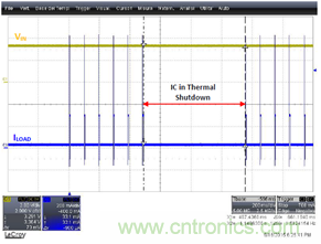 實驗未發現異常:封裝溫度最高值達到39.6°C。然后在Tamb=105°C下重復測試,驗證是否發生過熱關斷。