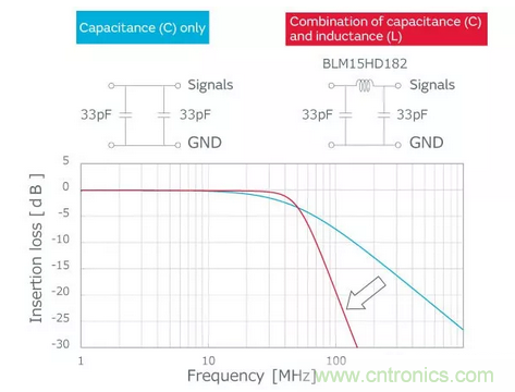 噪聲級(jí)別小或信號(hào)和噪聲的頻率相差大的情況下,可以只用電容器進(jìn)行降噪,但如果信號(hào)頻率和噪聲頻率相近時(shí),需要電感器和電容器組合來構(gòu)成插入損耗陡峭的濾波器。