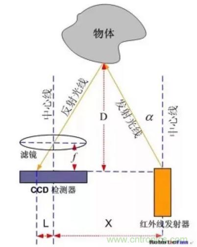 一般的紅外測距都是采用三角測距的原理。紅外發射器按照一定角度發射紅外光束,遇到物體之后,光會反向回來,檢測到反射光之后,通過結構上的幾何三角關系,就可以計算出物體距離D。