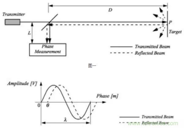 比較簡單的方案是測量反射光的相移,傳感器以已知的頻率發射一定幅度的調制光,并測量發射和反向信號之間的相移,如上圖一。調制信號的波長為lamda=c/f,其中c是光速,f是調制頻率,測量到發射和反射光束之間的相移差theta之后,距離可由lamda*theta/4pi計算得到,如上圖二。