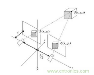 雙目視覺的測距本質上也是三角測距法,由于兩個攝像頭的位置不同,就像我們人的兩只眼睛一樣,看到的物體不一樣。兩個攝像頭看到的同一個點P,在成像的時候會有不同的像素位置,此時通過三角測距就可以測出這個點的距離。與結構光方法不同的是,結構光計算的點是主動發出的、已知確定的,而雙目算法計算的點一般是利用算法抓取到的圖像特征,如SIFT或SURF特征等,這樣通過特征計算出來的是稀疏圖。