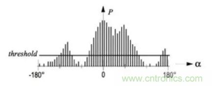它執行過程中針對移動機器人當前周邊環境創建了一個基于極坐標表示的局部地圖,這個局部使用柵格圖的表示方法,會被最近的一些傳感器數據所更新。VFH算法產生的極坐標直方圖如圖所示: