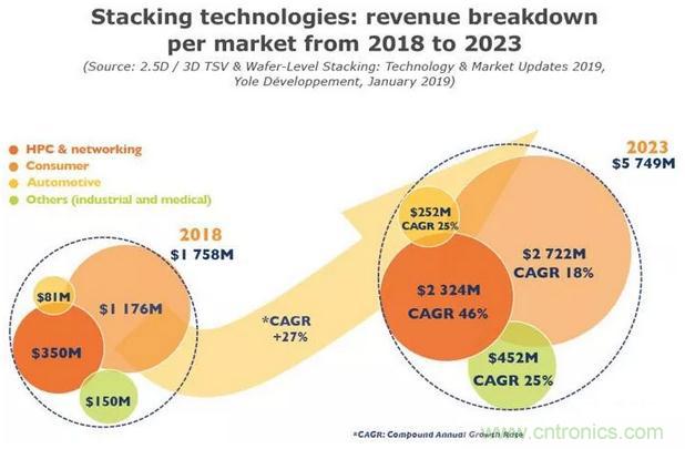 消費類市場(主要是CIS應(yīng)用),是2018年堆疊封裝營收的最大貢獻者,占據(jù)了65%以上的市場份額。盡管如此,高性能計算(HPC)是推動3D封裝技術(shù)創(chuàng)新的主要應(yīng)用,到2023年期間,該應(yīng)用增長速度最快,市場份額預(yù)計將從2018年的20%增長到2023年的40%。