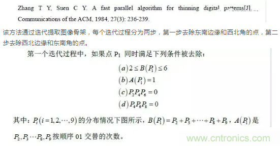 自適應閾值分割以后的激光條紋具有一定的寬度,直接處理計算量巨大而且精度較低,需要對圖像進行骨架細化得到單像素的線。