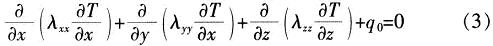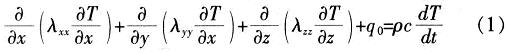 式中:T/x,T/y,T/z為沿x,y,z方向的溫度梯度;λxx,λyy,λzz為熱導(dǎo)率;q0為單位體積的熱生成;ρc是密度與比熱容的乘積:dT/dt為溫度隨時間的變化率。