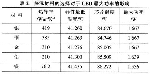 表2給出透鏡熱導(dǎo)率為0.2Wm-1K-1時,不同熱沉材料的導(dǎo)熱系數(shù)對于LED最大功率影響。由表2看出,熱沉材料對于LED的最大散熱能力的影響很小。[page]