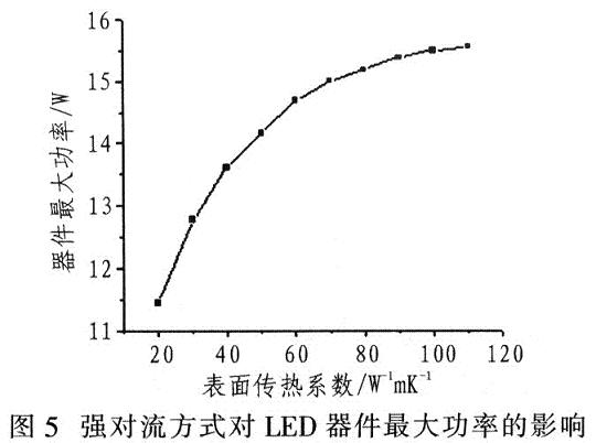 常見對流散熱方式有兩種:自然對流和強(qiáng)制對流。固定結(jié)構(gòu)的散熱與表面?zhèn)鳠嵯禂?shù)有關(guān)。空冷方式時,不同傳熱系數(shù)對最大功率的影響如圖5所示。強(qiáng)對流方式在一定速度內(nèi)會大大提高LED產(chǎn)品的散熱能力,有助于提高散熱效果。